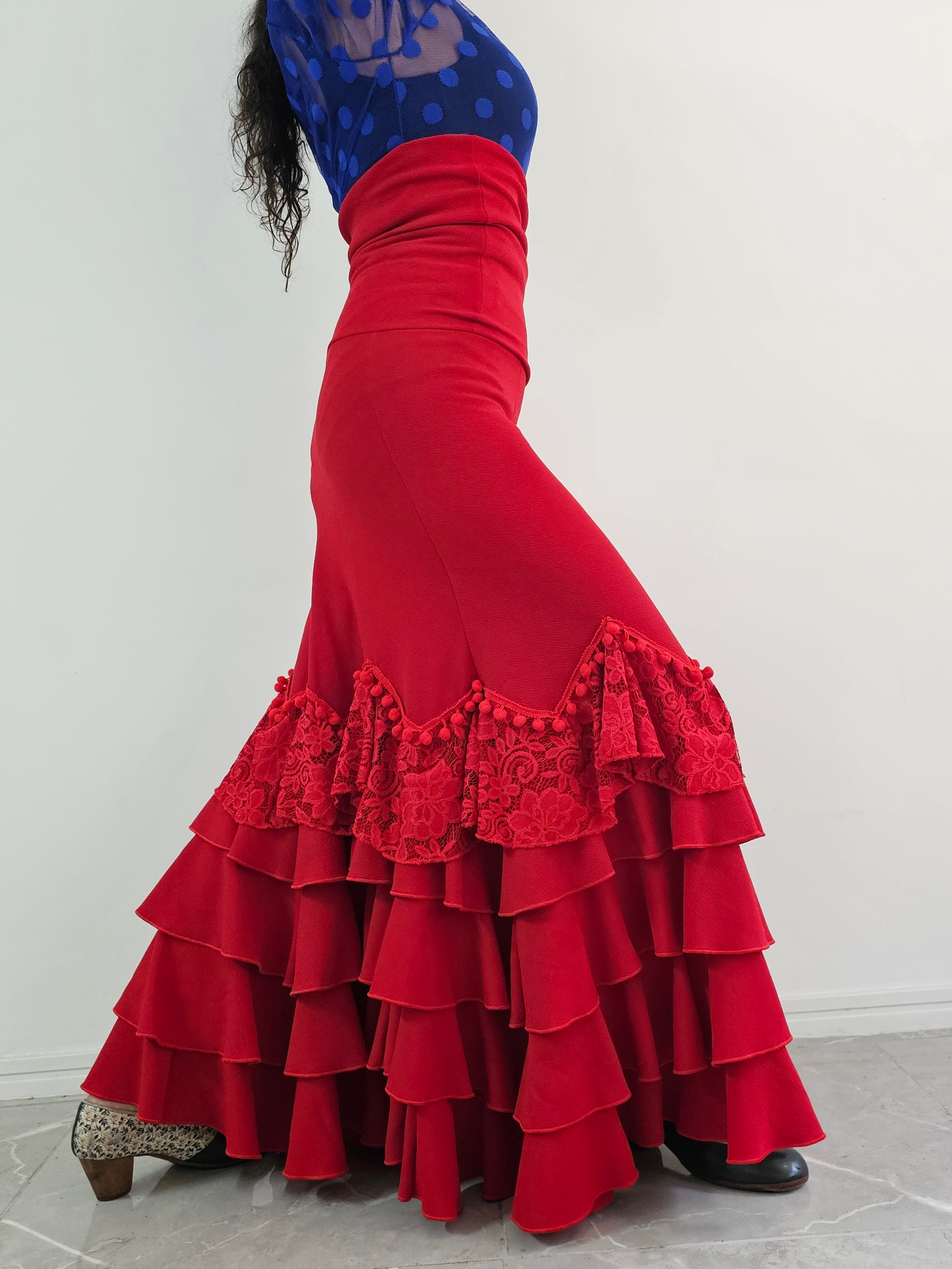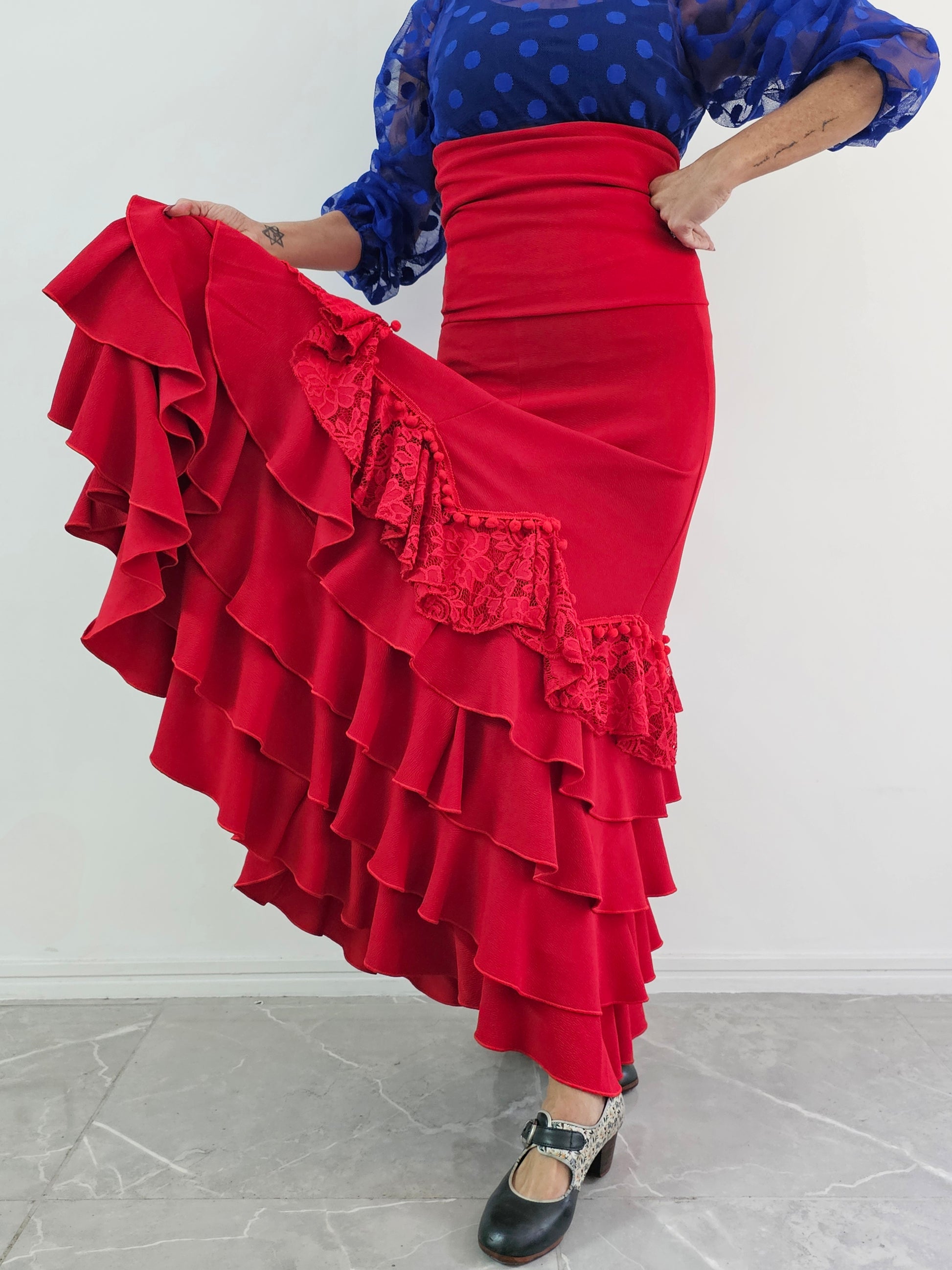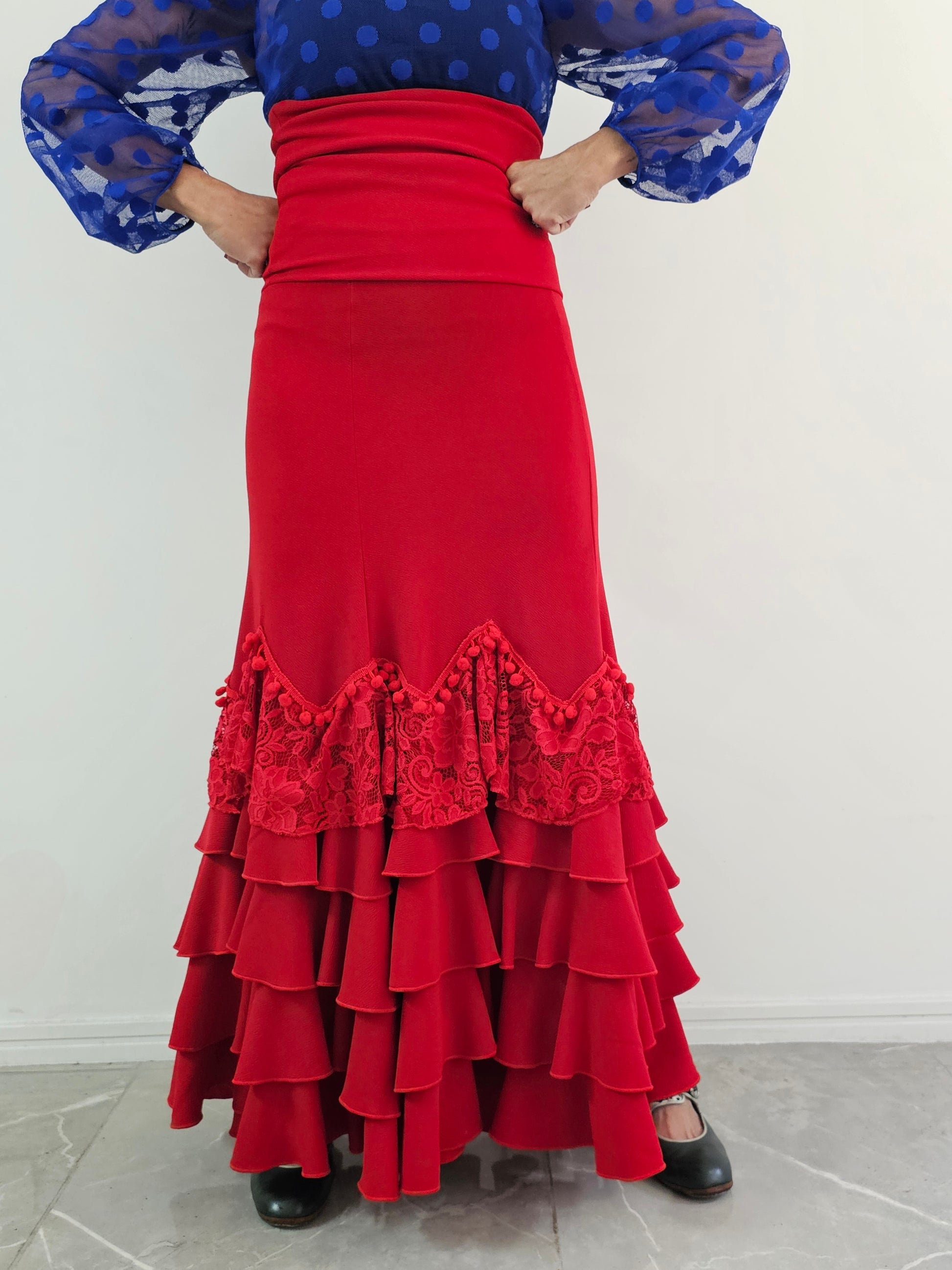 Saia em malha de poliéster com elastano mais grossa, babado de Renda aplicado sobre os demais. Aviamento em madronho aplicado sobre babado. Pala dobrável para ajuste de altura