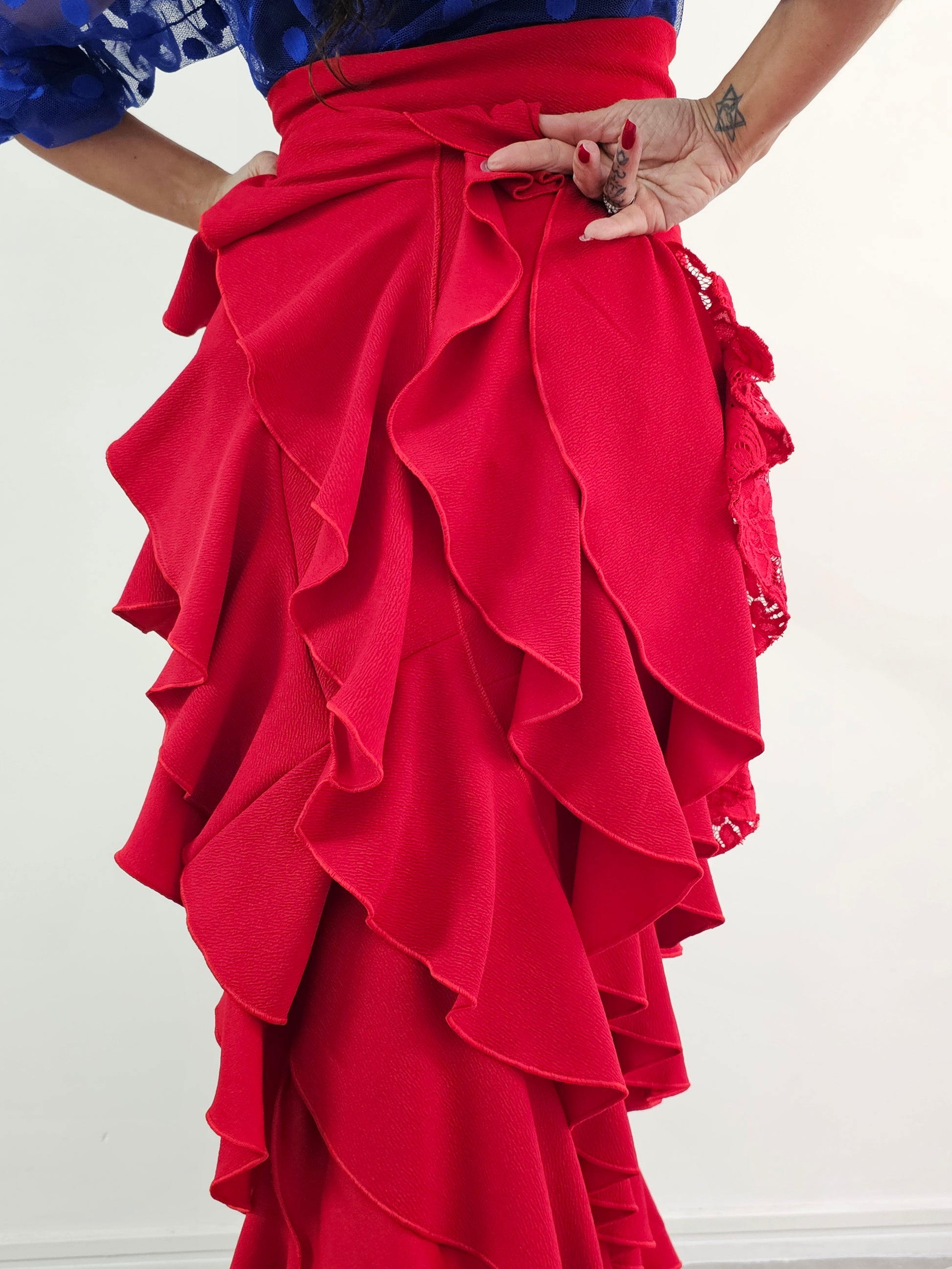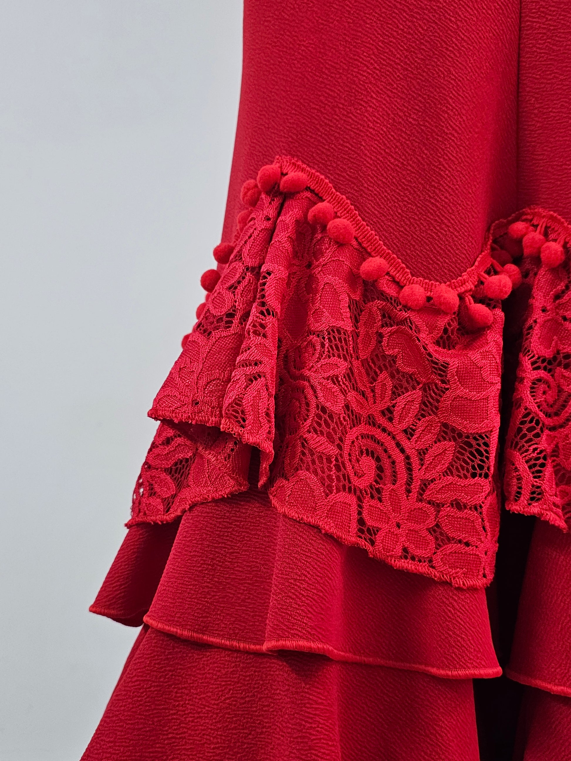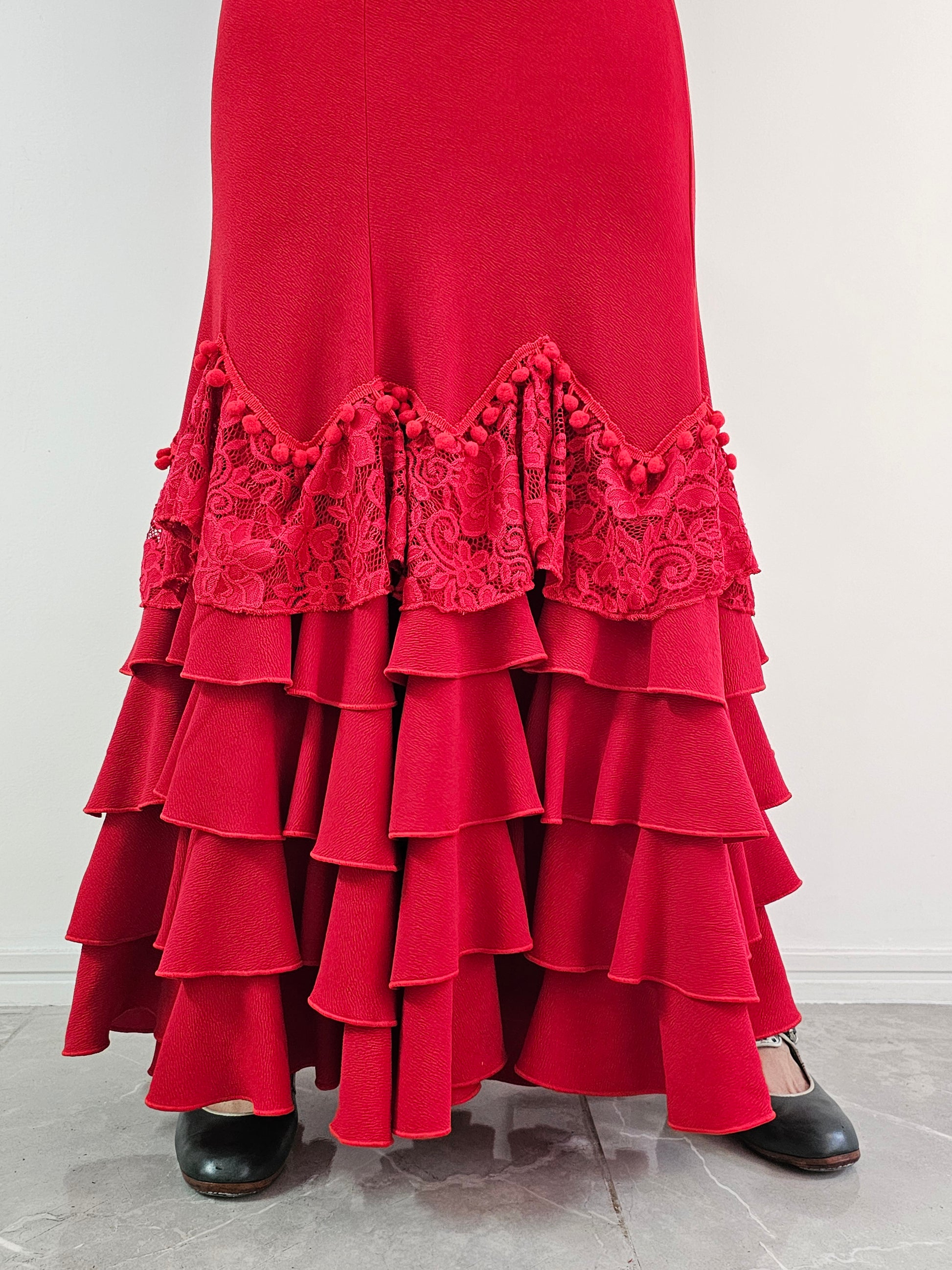 Saia em malha de poliéster com elastano mais grossa, babado de Renda aplicado sobre os demais. Aviamento em madronho aplicado sobre babado. Pala dobrável para ajuste de altura
